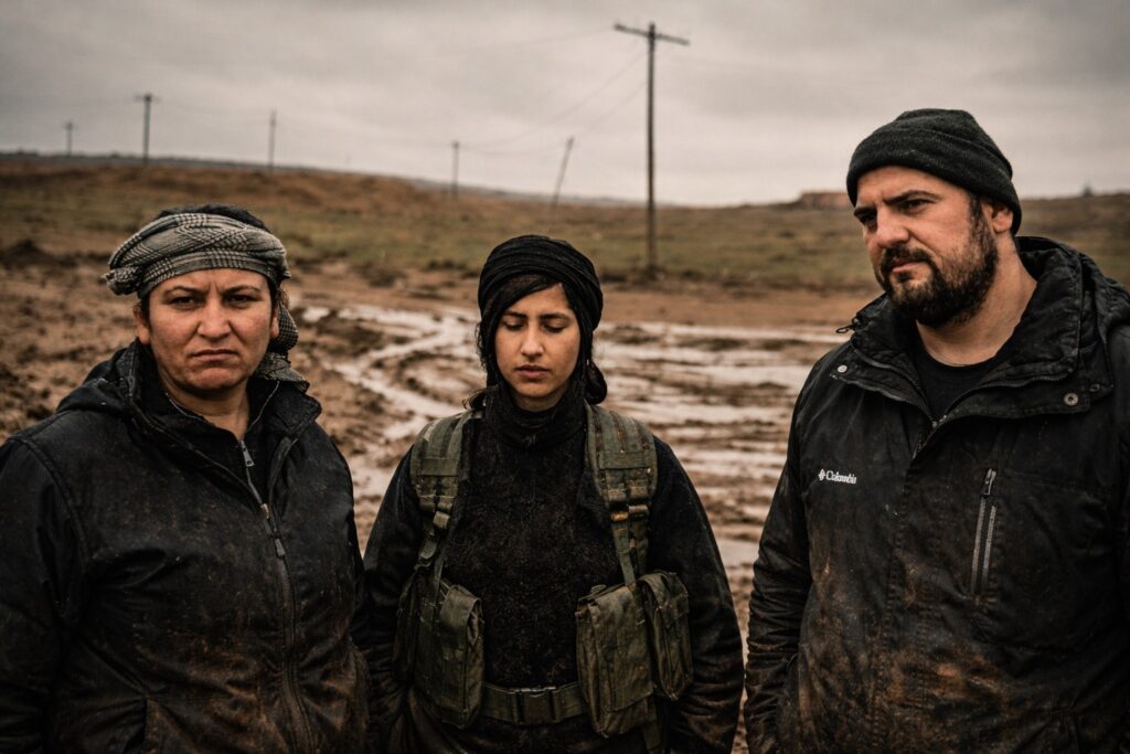 Drei kurdische Kämpfer:innen stehen nebeneinander an einer unbefestigten, schlammigen Straße in einer offenen, kargen Landschaft. Der Boden ist aufgeweicht, mit tiefen Fahrspuren und Pfützen, die den graubraunen Himmel spiegeln. Die Umgebung wirkt kalt, windig, ungeschützt.